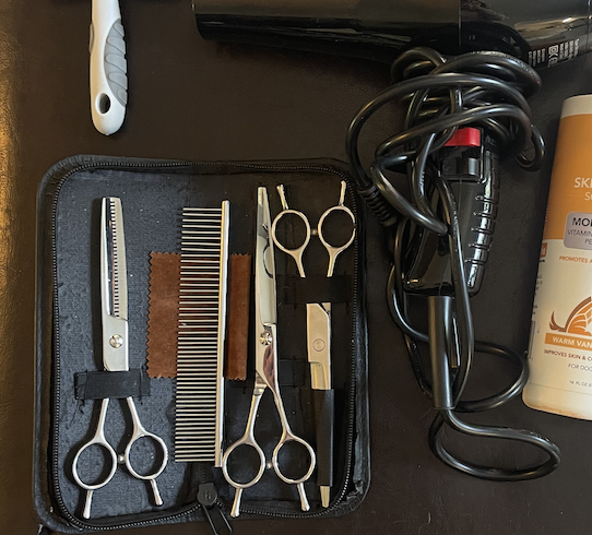 Trimmaussaksisettiin löydät linkin kotitrimmaus-oppaasta liittymällä sähköpostilistalle. Setti on alle kolmekymppiä, ja sisältää kolmet laadukkaat sakset, metallikamman ja säilytysrasian! 🙂